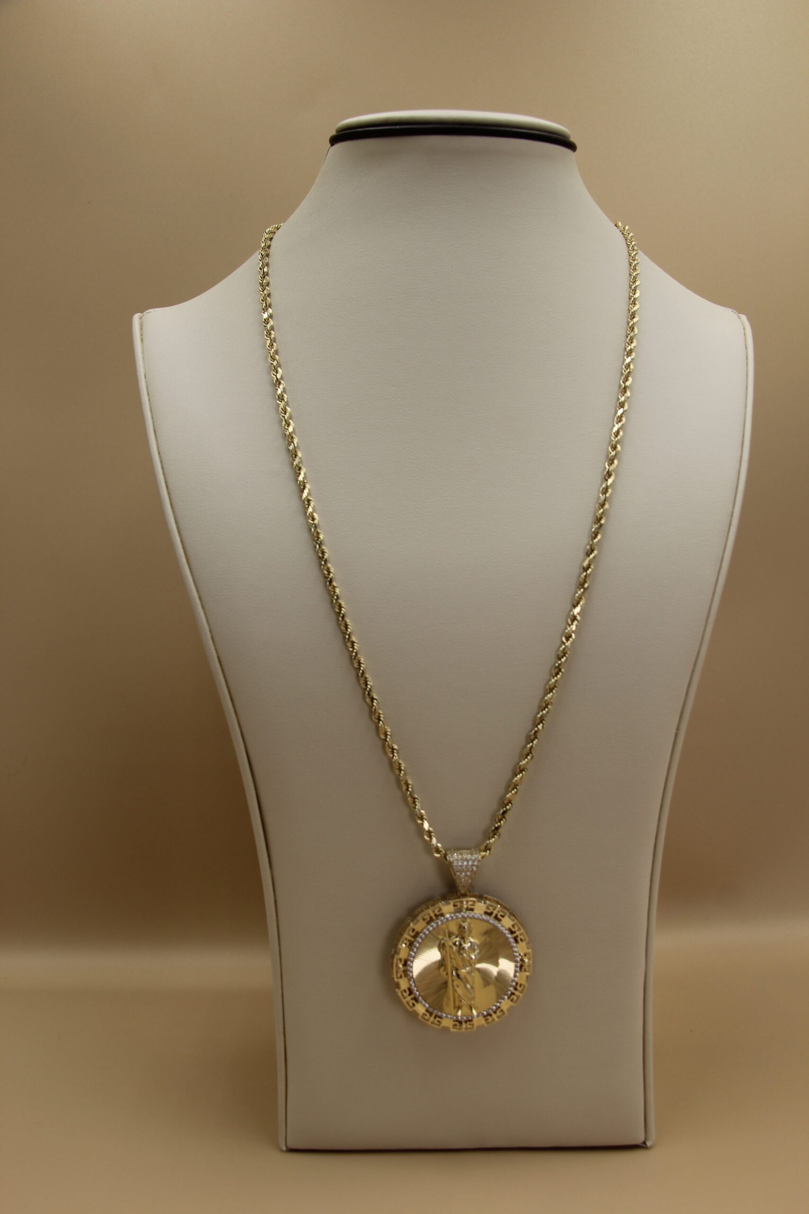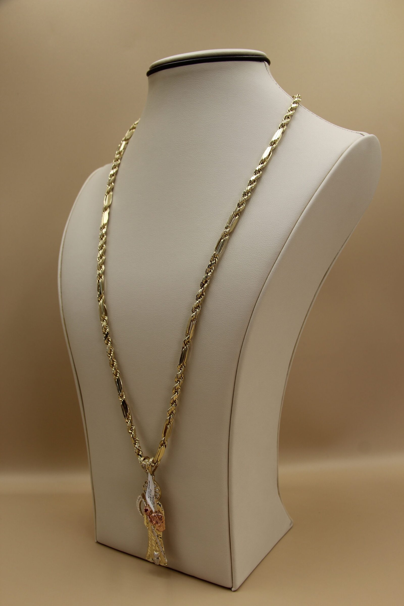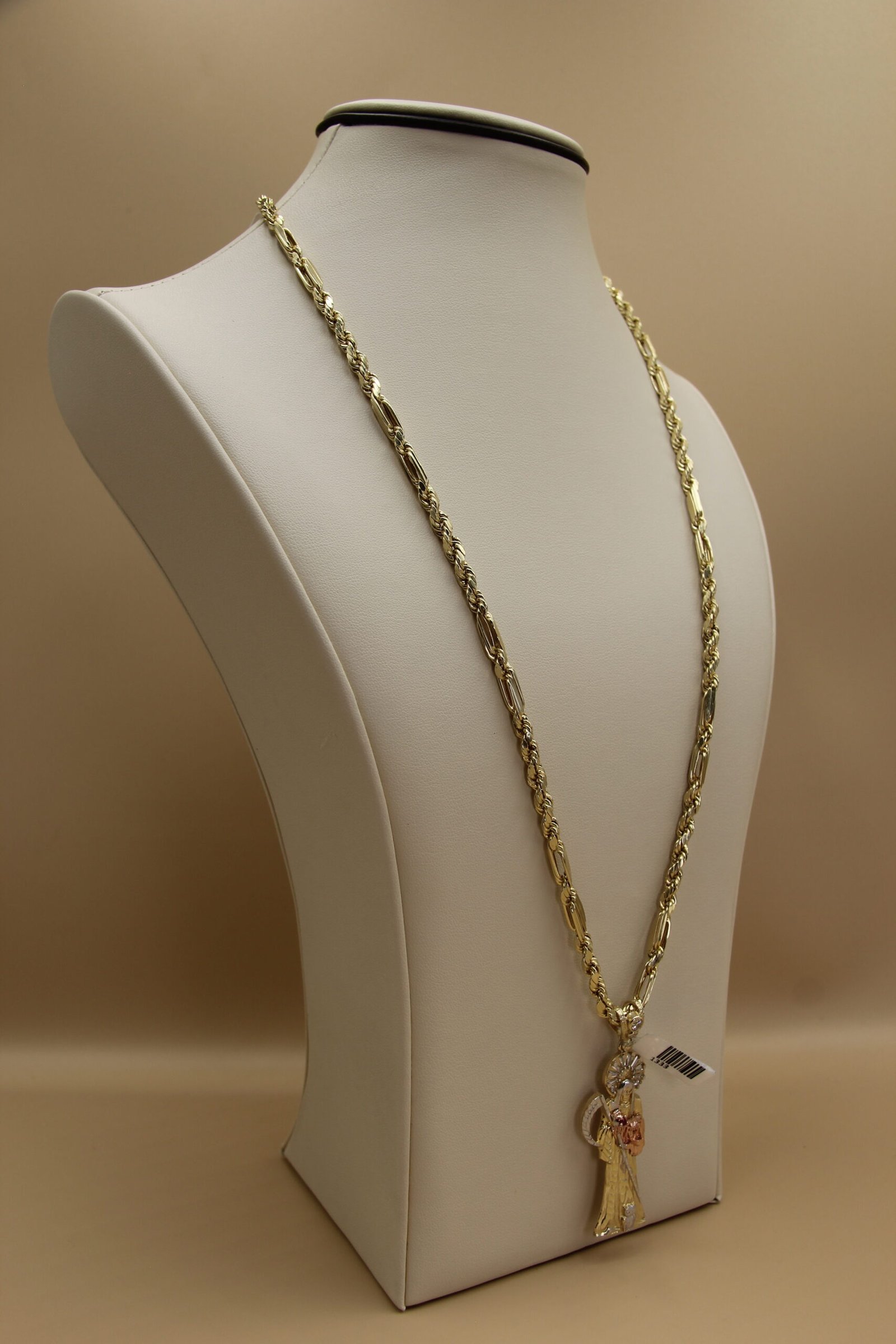 Discover the stunning 10k Milano Chain with a delicate Santa Muerte pendant. This unique piece combines the sophistication of Italian design with the profound spirituality of the figure of Saint Death, symbolizing life and death. Ideal for those seeking a piece of jewelry that not only complements their style but also offers special meaning. Its lustrous finish and detailed craftsmanship make this chain a perfect accessory for any occasion, whether a formal event or a casual outing. Carry a protective amulet with you with this exquisite necklace.