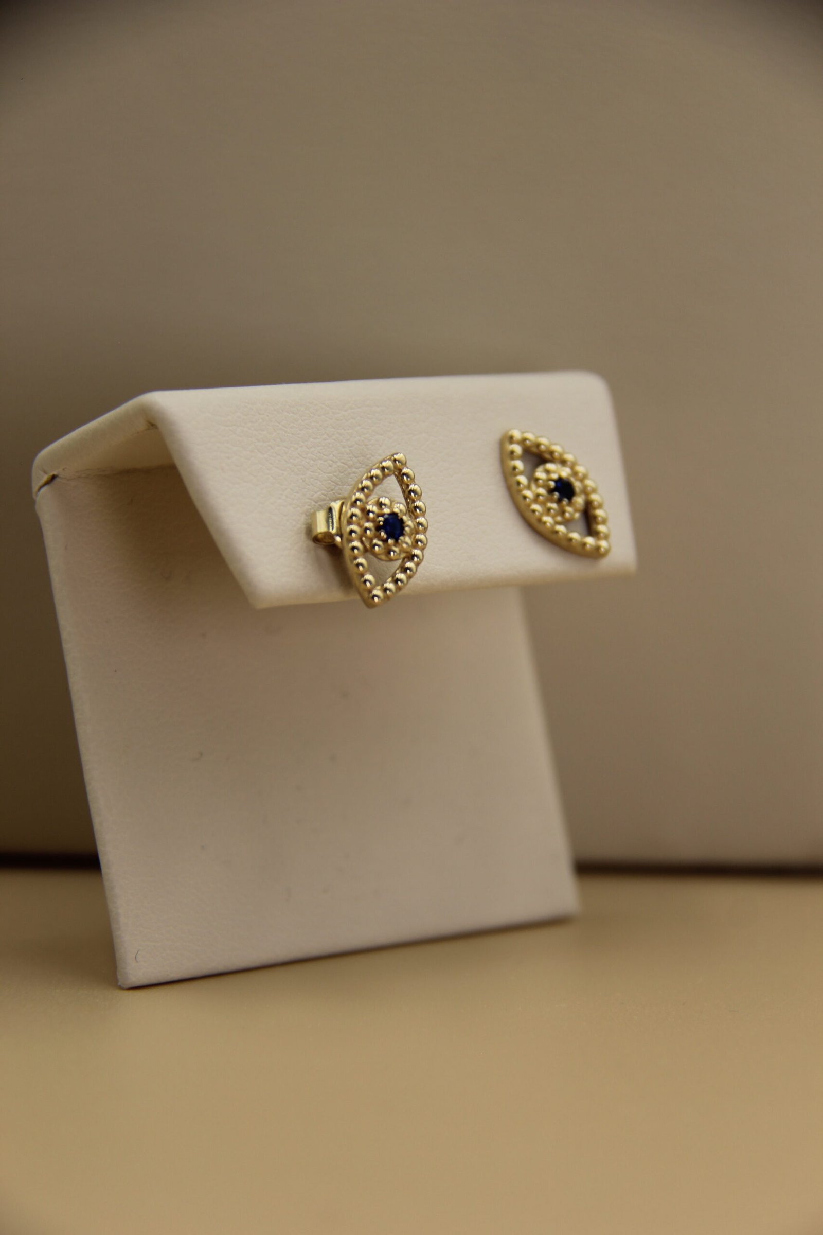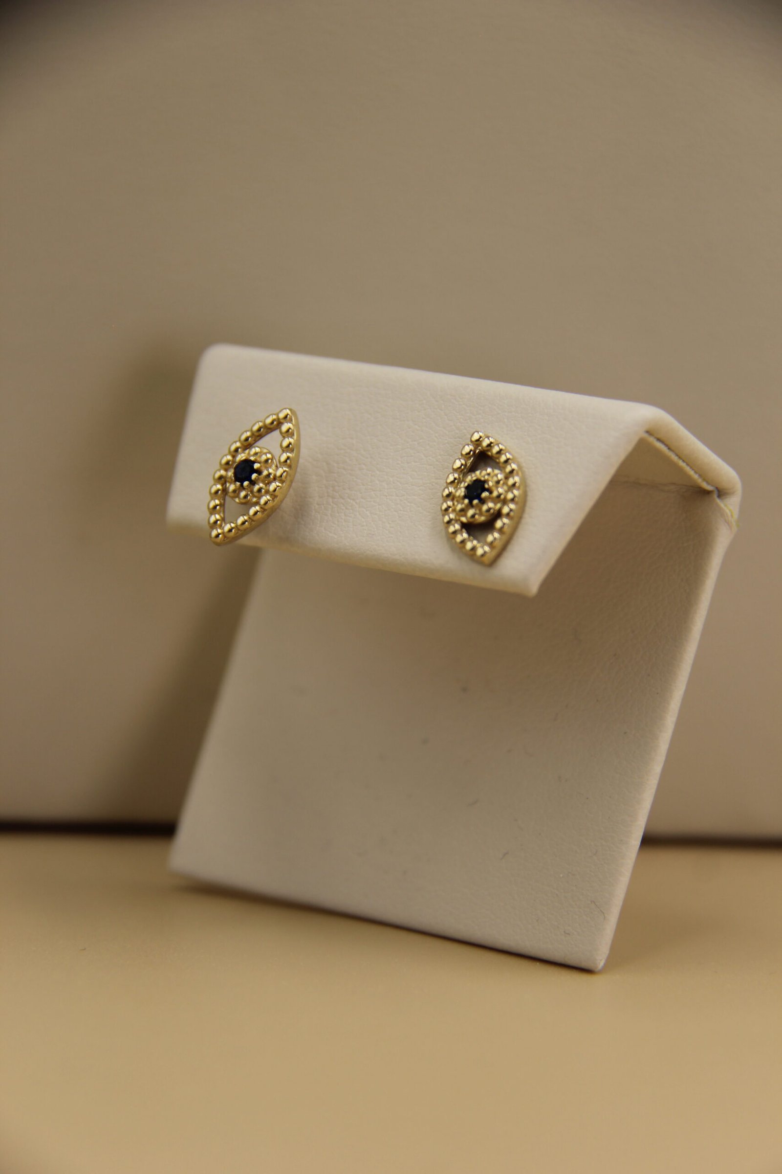 These beautiful eye-shaped stud earrings are crafted from 10-karat gold, offering a perfect blend of sophistication and charm. Their unique design adds a touch of style to any outfit, whether for everyday wear or for special occasions. With their lustrous finish and meticulous details, they are the perfect complement to highlight your natural beauty and serenity.